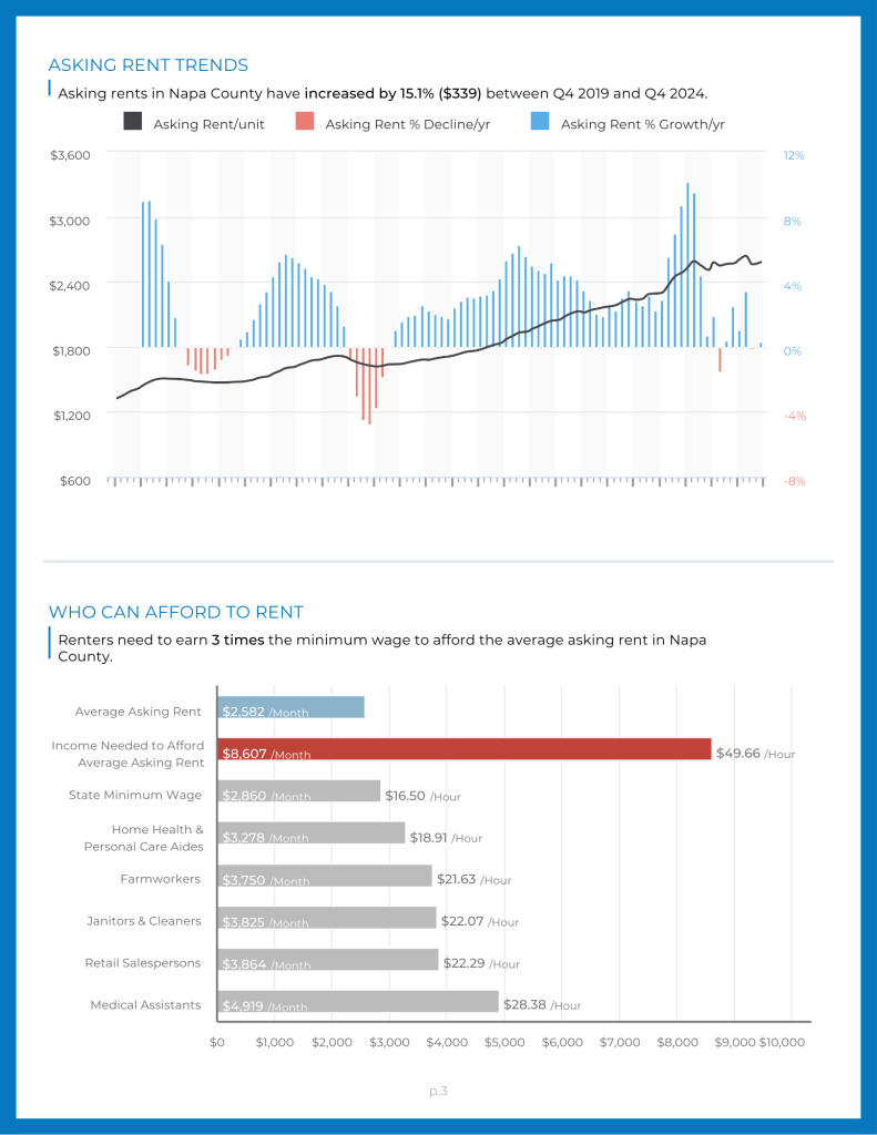 • Renters in Napa County need to earn $49.66 per hour – 3 times the state minimum wage of $16.50/hour – to afford the average monthly asking rent of $2,582.