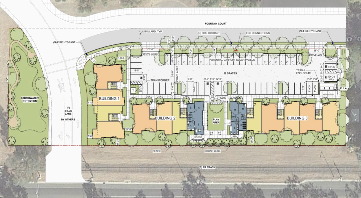 The site plan is below. The project includes a mix of 1-, 2- and 3-bedroom apartments, a community hub with indoor and outdoor common areas, a central play area, a bioretention area that doubles as a passive recreation space, solar panels, bicycle storage, low water-use fixtures and landscaping, and a public art opportunity.
